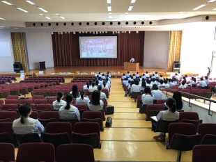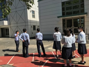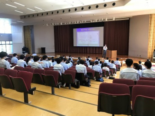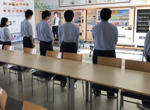 また、校内見学では1クラスを2班に分けて食堂や、体育館、図書館など計18カ所を巡りました。見学では、私語を慎み、前後の間隔を空けて、水分補給をしながら30分くらい歩きました。みなさん興味津々な様子でこれからの学生生活に胸を膨らませている様子が伺えました。