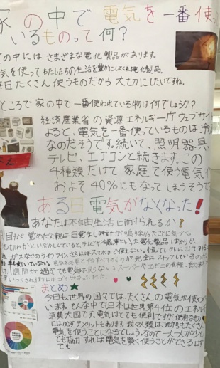 ・電気が一切無い世界では生きていけないと思った。もし仮に電気が一切無かったら生活している時に必要なものがなくなるし料理も日本は世界で四番目に電力を消費してることがわかったので、もっと無駄な電力を使わないように努力しようと思った。