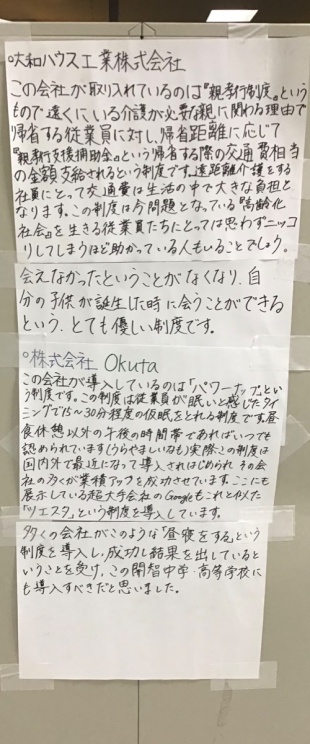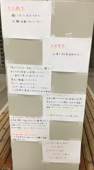 ・働き甲斐と経済成長は両立が難しいことですが会社側の工夫であったり考え方などを通じて取り組んでいけたらいいと思いました。考えるのはもちろん、自分なりの結論が見えた後、働いて現実を知るなかで「仕方ない」と割りきるような大人にならないのが最も重要だと考えました。