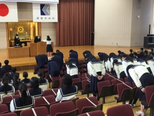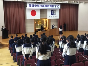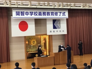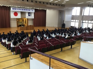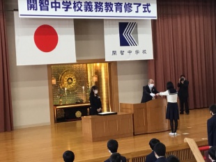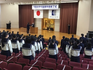 2021年03月24日(水) 過去のニュース 中3 義務教育修了式 本日義務教育修了式を挙行しました。中等部3年生146名のみなさん、義務教育修了おめでとうございます。 校長先生の話にもあったように、来年度からは義務ではなく、自らの意思で勉学に励むこととなります。その自覚を忘れず、ときに中等部で過ごした3年間を思い出しながら、充実した高校生活を送るとともに将来の自分の夢や目標に向かって突き進んでいってください。