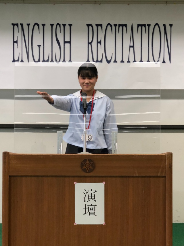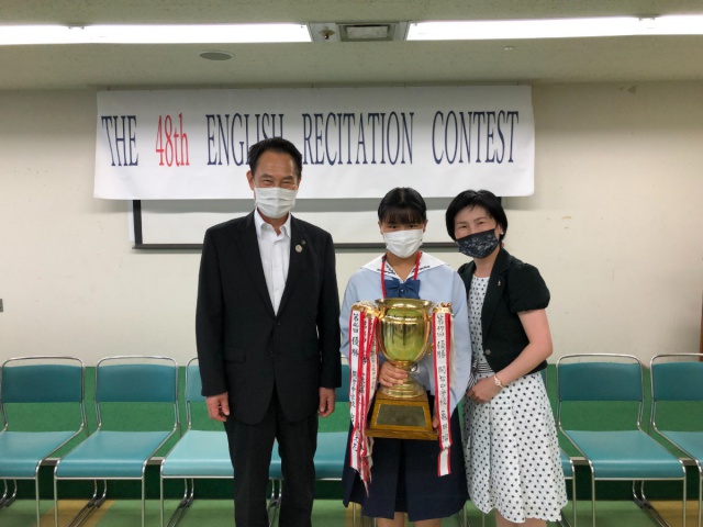2021年09月27日(月) 過去のニュース 第48回中学生英語暗唱大会 9月26日(日)、和歌山市・和歌山国際姉妹都市親善協会主催の第48回 中学生英語暗唱大会が実施されました。本校から出場した中学3年生の松尾月渚さんが、優勝しました。タイトルは「Fly Away Home」です。これまでの練習の成果を十分に発揮し、笑顔で堂々としたスピーチを披露してくれました。聴衆の心に響く素晴らしいスピーチでした。おめでとうございます。