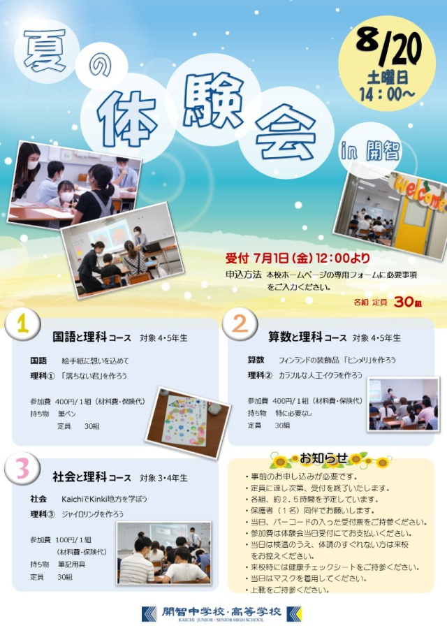 8月20日(土)14:00から、小学校3年生から5年生のお子様方の夏休みの思い出になるような体験授業を本校にて実施いたします。