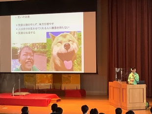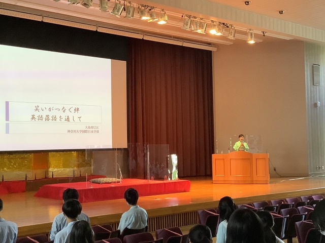 神奈川大学国際日本学部 大島希巳江先生をお招きし、ご講演と英語落語を鑑賞しました。笑いが世界中の人々を繋ぐ経験談を交えた講演とわかりやすくユーモアのある英語落語を披露していただき、先生の「Laugh & Peace」の心がとても伝わる時間でした。