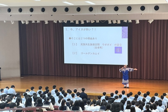 2023年05月22日(月) 過去のニュース 【中5・高2】人権学習 北海道へ修学旅行に行く中5高2に向けて、アイヌ民族の文化や精神を学ぶ人権学習が開かれました。 北海道で暮らした経験がある本校社会科の南先生が、民族衣装や北海道ファイターズのユニフォーム姿で、ゴールデンカムイやお土産などの楽しい話を交えながら、深い洞察でアイヌ文化についてお話ししてくださいました。 カント オロワ ヤク サク ノ アランケ シネ カ イサム (天から役目なしに降ろされた物は一つもない)