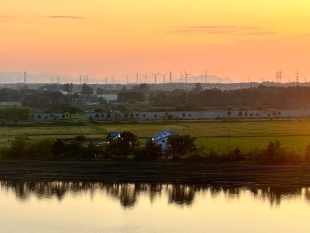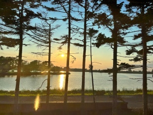 夕日が美しい時刻にホテルに到着しました。お部屋からは、石狩川につながる一級河川の茨戸川や、風車が望めます。