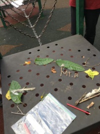 グループに別れて公園内で集めたものを用いて思い思いの絵を作成しました。大自然に囲まれながら英語を学習する、とても良い体験になりました。
