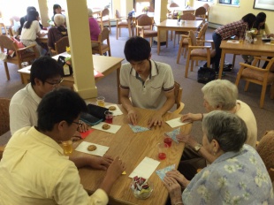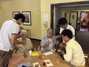 日本から持ってきた折り紙、剣玉、あやとり、お手玉などの日本文化をなんとか伝えようとしている生徒達の一生懸命な姿勢がよく伝わりました。お年寄りの方々は、その一生懸命な姿を自分の口でなんとか表現できるまで温かく見守ってくださいました。