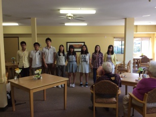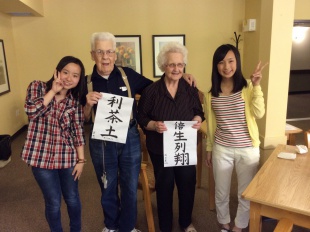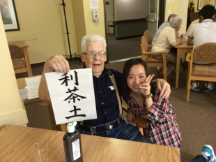 中でもお年寄りの興味をひいたのは、書道です。お名前を漢字で書いてプレゼントすると非常に喜んでくださいました。リチャードさんは喜びのあまり、半紙を持って歩きながら嬉しそうに周りの人に見せていました。