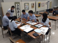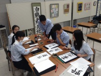 次に、書道部では、書道部の先生のご指導の下、ご自身のお名前を習字で練習。その後、2枚のうちわに清書し、粋なお土産を自作していただきました。先生、ご指導ありがとうございました。