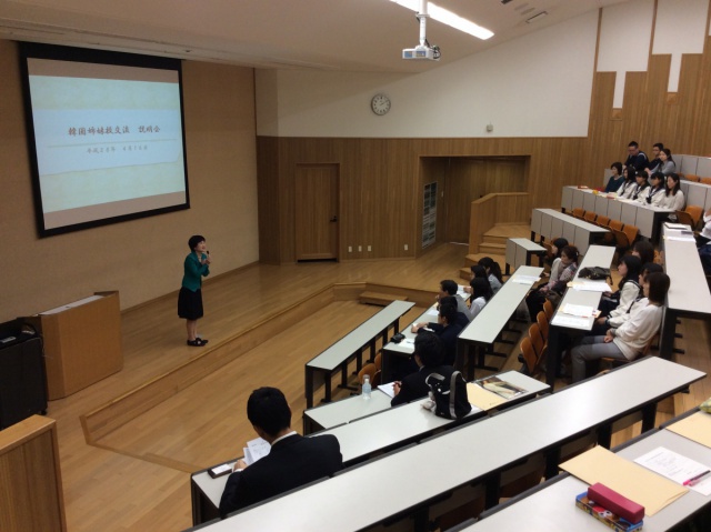 2016年04月16日(土) 韓国姉妹校交流 < 国際交流(研修) < 過去のニュース 韓国姉妹校訪問説明会 本日は14時からプラセットホールで韓国姉妹校訪問の説明会が行われました。たくさんの保護者の方達と生徒が真剣に、説明に耳を傾けていました。また今年も韓国との姉妹校交流を通して、多くの生徒が人間的に大きく成長してくれることを期待しています。