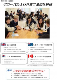 2014年06月03日(火) Global Mind < 国際交流(研修) < 過去のニュース 国際交流紹介リーフレット 学校説明会などの際に配布しています、本校の国際交流に関する取り組みを紹介したリーフレットです。 今年の8月には、カナダのバンクーバーへの語学研修が、初めて実施されます。 また、英国の名門校「Dartford Grammar School」との交流派遣プログラムも、新たに始まります。 ← 拡大表示・プリントアウトをされる方は、左のアイコンをクリックしてください。