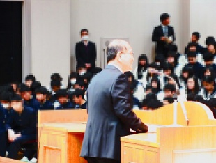 何事も、「真面目・素直・謙虚」に、果敢に目標に向かってチャレンジすることができ、自らの持ついいところを出せるように、自分を大切にする行動ができたかを振り返り、これからも、人として成長をつづけられるよう、向上心を持って行動して下さいと、生徒たちに話されました。