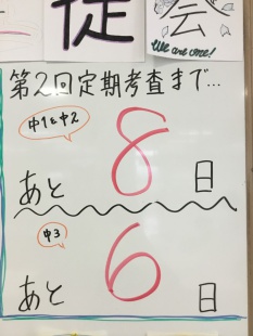 2020年07月07日(火) 全校 < 過去のニュース 第2回定期考査 第2回定期考査まで、中1・2を除く学年は1週間をきりました。 中学校の職員室前ホワイトボードには、 生徒会の役員たちがカウントダウンをしてくれています。 新型コロナウィルスの影響もありましたが、 テストまでの時間は、しっかりと勉強に向き合ってくれると期待しています。 テストまで頑張りましょう!