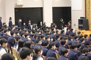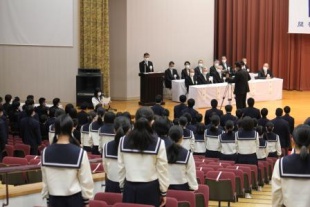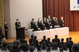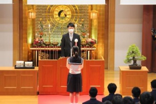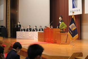 新型コロナウイスル感染症がひろがりを見せるなか安全を確保するため、マスクを着用、間隔を開けての座席をとり式次第を進行いたしました。また、保護者の方には、別室にて会場の様子をリアルタイム配信する形にて参加していただきました。