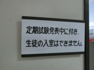 2015年05月11日(月) 全校 < 過去のニュース 試験発表(定期考査一週間前) 照葉樹林のクスノキ 定期考査一週間前となり、定期考査の時間割が発表されました。弱点にしっかりとむきあい、克服して試験に臨みましょう。 定期考査中は職員室には入れません 放課後のアカデミックラボ