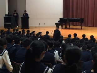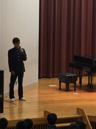 先輩達からの歓迎を受け、新入生代表生徒はしっかりと挨拶を返していました。マイクを通し皆に向けて話をするのはとても緊張することだと思いますが、歓迎の雰囲気が新入生の背中を押してくれたようでした。最後に、各クラス代表者へ入学記念品の贈呈がありました。