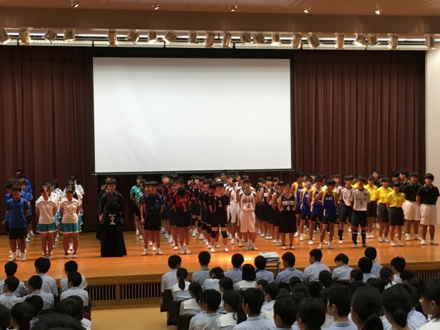 2017年07月08日(土) 中等部 < 過去のニュース 中体連壮行会 6限目、開智ホールにて、中体連壮行会が行われました。中学校体育会系クラブが集合し、各クラブのキャプテンが大会への意気込みを力強く語ってくれました。中村教頭先生からは、爽やかに正々堂々とプレーをしてきてくださいと激励のお言葉をいただきました。生徒会からは、努力は必ず糧になると心強いエールがおくられました。選手の皆さん、素晴らしい活躍ができるよう、私たちも応援しています。全力で戦ってきてください!