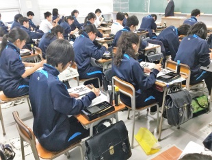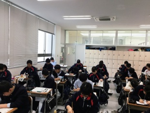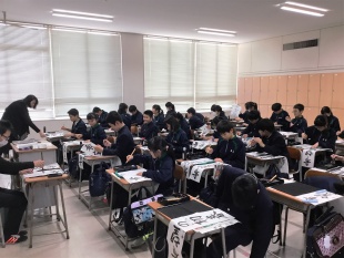 2019年01月09日(水) 中等部 < 過去のニュース 中学校 書き初め会 本日の5,6限は中学校全体で書き初め会を行いました。 1年生は、「希望の初春」 2年生は、「初日の輝き」 3年生は、「新たな挑戦」 という字を、毛筆で、1年生は楷書体、2/3年生は行書体で 丁寧に、1画1画心を込めて書き上げていました。 日頃から自分の字とここまで向き合う時間はあまりないので 貴重な経験になったのではないでしょうか。 いつもの硬筆ではない字の味を深く味わい、日本語の文字の美しさに触れて、 また明日から丁寧に文字を書いてくれることを期待しています。