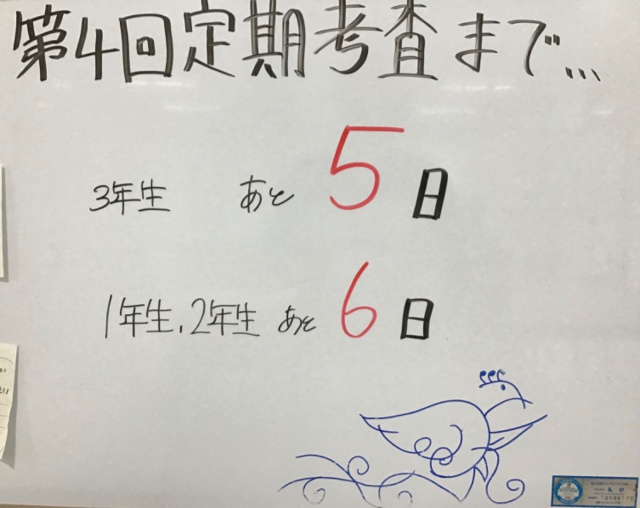 2020年11月25日(水) 中等部 < 過去のニュース 第4回定期考査 第4回定期考査まであと1週間もありません。 日頃の勉強の成果を発揮する時です。 自分自身の納得がいく結果を出せるように テスト当日まで、しっかりと頑張りましょう!