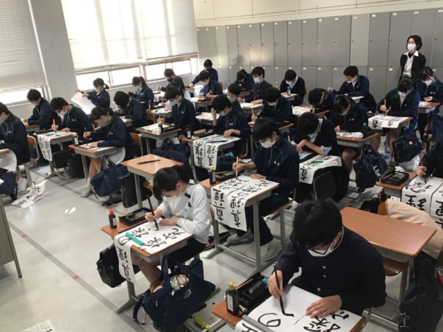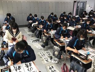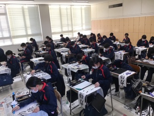 2021年01月13日(水) 中等部 < 過去のニュース 書初会 本日の5,6限は中学校全体で書き初め会を行いました。 1年生は、「力強い出発」 2年生は、「友好の精神」 3年生は、「真理の探究」 という字を、毛筆丁寧に、1画1画心を込めて書き上げていました。 日頃から自分の字と向き合う時間はあまりないので 貴重な経験になったのではないでしょうか。 いつもの硬筆ではない字の味を深く味わい、日本語の文字の美しさに触れて、 また明日から丁寧に文字を書いてくれることを期待しています。