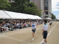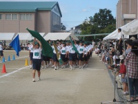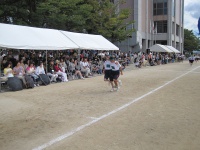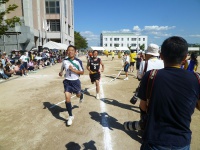 各クラスのブロックの代表が100メートルをリレーします。体育祭も終盤に近づき体力も少ない中、ブロックの勝利を信じて懸命に駆け抜けていました。