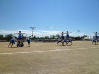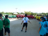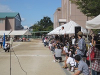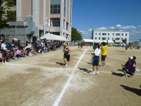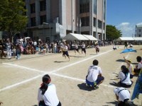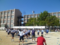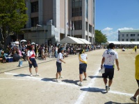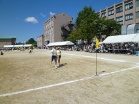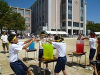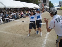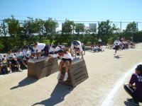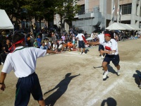 シーソーにボールを乗せボールを蹴り上げ、バケツでキャッチという競技です。非常に難しい競技ですが、生徒は一回で成功させていました。また、大きくボールを蹴り上げ会場を沸かせていました。
