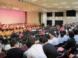 歌の途中、体でリズムを取っている生徒もいて育友会コーラスの皆さんの歌声を楽しんでいました。