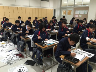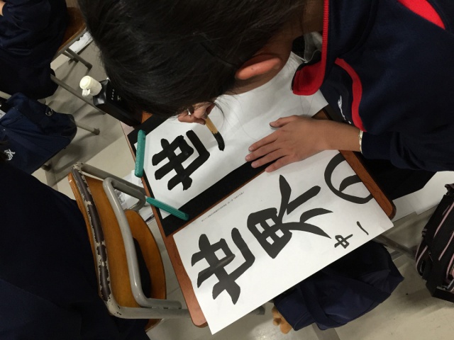 2015年01月14日(水) 中等部 < 過去のニュース 書き初め会 本日5・6限目、中等部1・2・3年生は「書き初め会」を行いました。 縦書きの長い半紙なので最初は書きにくそうにしていましたが、練習を重ねるとみるみるうちに上達していました。上手に書いた作品を選んで、競書会に出展します。
