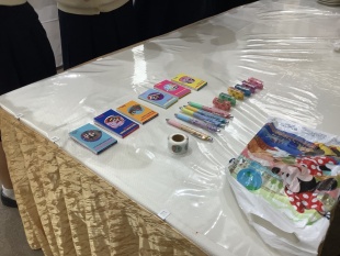 食事のお盆を裏返してみると…シールがあった人は当たり!18名にディズニーのプチギフトです。シールの1つが藤岡先生のお盆にあったので、急遽ジャンケンチャンスがうまれました。