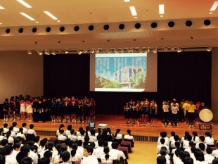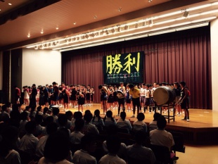 本日6限目、中学生は開智ホールにて、中体連の壮行会を行いました。大きな拍手に迎えられ、校歌斉唱をし、各クラブのキャプテンが力強い声で試合に懸ける決意表明をしてくれました。またこの日のために、生徒会と各クラブのキャプテンを中心に、決意がびっしり書かれた大きな大きな旗を作成してくれました。彼らのメッセージがよく伝わる見事な旗でした。中村教頭先生から激励のお言葉をいただきました。「練習時間が十分でなくとも、また土曜日の応援団が十分にいなくても、爽やかに闘って思いきり楽しんできてください」という温かいメッセージは、きっとクラブ員達への励みになったことでしょう。当日は練習の成果を発揮して、自分にとって1番のプレーをしてきてほしいですね。
