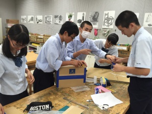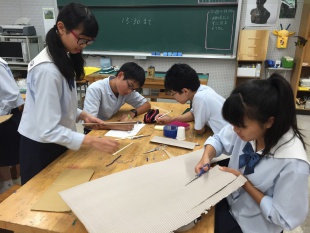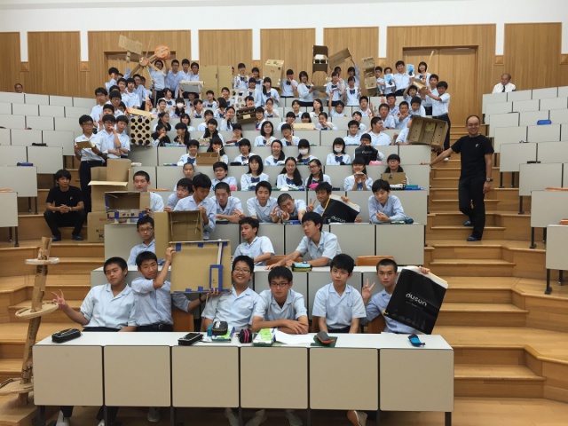 当日は、30分の講義の後、ダンボール等を使って試作品の製作に取り掛かりました。