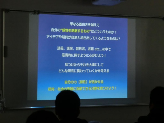 さらに,研究に向かう姿勢やどのように研究テーマを探すのかという心構えについても大切なお話をいただきました。