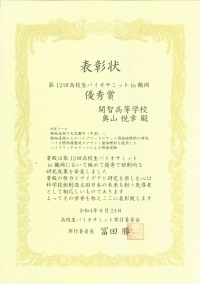 8月22日(月)~8月24日(水)に行われた、第12回高校生バイオサミットin鶴岡において、6年3組奥山悦幸君が優秀賞を受賞しました。1回戦はオンラインプレゼンテーション、決勝は山形県鶴岡市先端研究産業支援センターで口頭発表が行われました。奥山君は、「微細藻類で大気圏外(宇宙)へ微細藻類からのハイブリッドロケット用固体燃料の研究 バイオ燃料精製材スクアレン固体燃料を使用したハイブリッドロケットによる燃焼実験」というタイトルで研究発表を行いました。環境にやさしい航空機燃料開発のため、愛媛大学グローバルサイエンスキャンパスやJAXA主催の大樹エアロスペーススクールなどで取り組んだことが実を結びました。