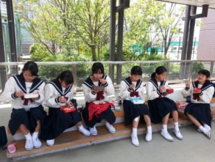 2016年04月20日(水) 中1 < 過去のニュース 中1 ランチタイム 教室で。 中等部1年生のランチタイムです。 教室で食べるグループ、オープンスペースグループ、そしてピクニック気分の屋外グループも。 それぞれ、ワイワイにぎやかなランチタイムの風景です。 お弁当を作ってくださるおうちの方に感謝して、おいしくいただきましょう。 1階オープンスペースで。 ピクニック気分!