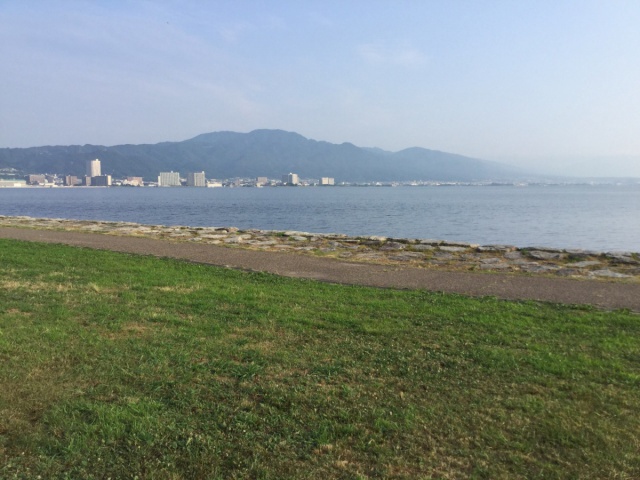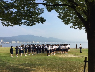 7時前にホテル前の芝生広場に集合し、琵琶湖の湖畔を散策しました。良い天気の空の下、ストレッチ体操がとても気持ち良さそうでした。
