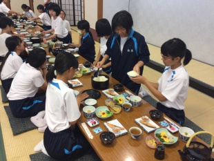 御飯をよそってあげたり、お茶をついであげたり、周りを思いやって行動することが自然にできる1年生達です。