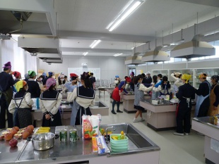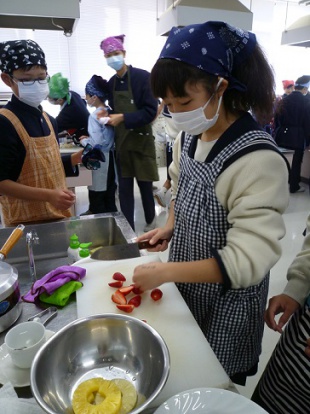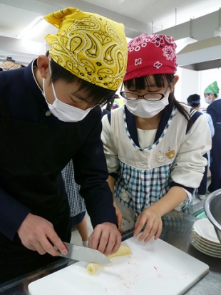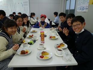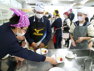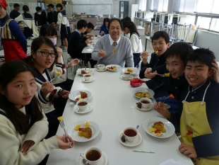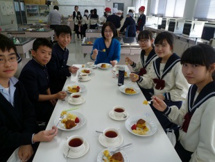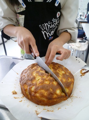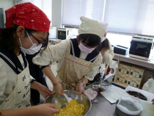 2017年03月18日(土) 中1 < 過去のニュース 英語でクッキング(中1理進) 中学1年生のスーパー理進の生徒達は、午後から英語でクッキングを行いました。教員の英語での指示を注意深く聞いて意味を推測しながら、班員と協力して作っていました。どの班も笑顔が絶えず、とても楽しそうでした。全班、無事にアップルケーキが焼き上がり、大成功!みんなでおいしくいただきました。