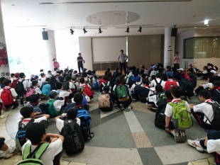 稲むらの火の館見学と、津波堤防の見学の2グループに別れての防災学習です。