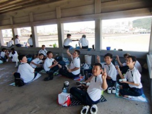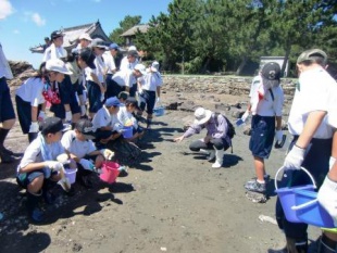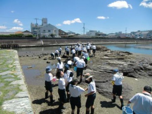 2015年07月14日(火) 中1 < 過去のニュース 中1理進・和歌浦干潟観察 和歌山大学古賀庸憲教授より和歌浦干潟に現存する絶滅危惧種に指定されたカニ・カイ類の説明を受けたあと、実際に干潟で実習・観察を行いました。理科好き理進クラスでは、生徒の関心度がとても高く、古賀教授に質問しながら一生懸命観察を続けていました。 気温も高く熱中症が心配されましたが、各自水分補給と休憩をとりながら全員元気に帰校しました。
