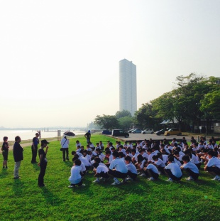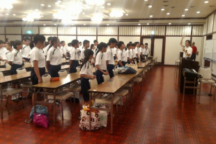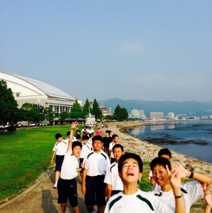 中1全員元気に勉強合宿2日目の朝を迎えました。琵琶湖湖岸でストレッチ体操をした後、30分程度散歩をしました。にぎやかに朝食を終え、1限目国語・社会の授業が始まりました。
