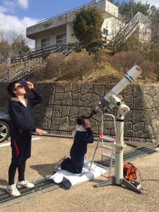 太陽は決して肉眼で見てはいけません。専用の眼鏡や専用の望遠鏡を通して、観察しました。