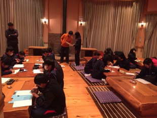 上の写真は、朝食後に行われた暗記の確認大会の様子です。