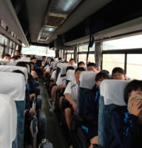 8:30、無事に学校を出発しました。只今バスの車内ではDVD鑑賞中で、大笑いが沸き起こっています。