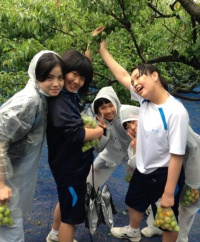 その後、梅もぎ体験をしました。小雨が降る中カッパを着ながら、袋が梅でいっぱいになる程たくさん入れていました。この梅はお家に持って帰って梅シロップに出来るそうです。嬉しいお土産が2つもできましたね。