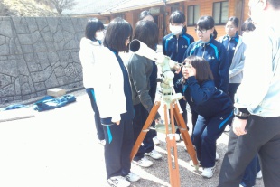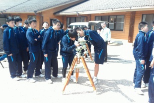 午前中の授業の後、玄関前広場で、望遠鏡の操作方法について講習を受け、自分たちで実際に望遠鏡を操作してみました。今夜は、自分たちで設置した望遠鏡で、月の観測ができるかもしれません。