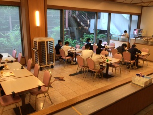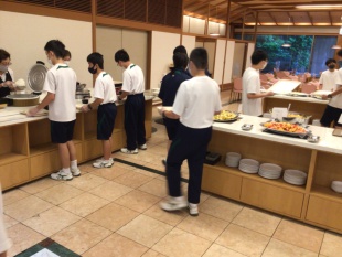体験学習2日目がスタートしました。 少し眠そうな人もいますが、元気に朝食を食べています。 今日は熊野古道ウォークからです。