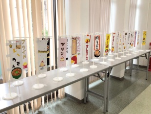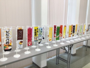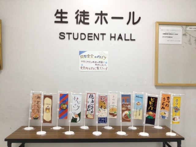 2023年09月22日(金) 中2 < 過去のニュース 中学2年生が生徒ホール(学食)とコラボ 中学2年生が生徒ホールの集客力アップをお手伝いするために、美術の時間を使って自分のお気に入りのメニューの『のぼり』を作成しました。 ただ今生徒ホールに展示中です。来週から生徒ホールの利用者がさらに増えることを期待しています。