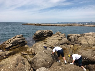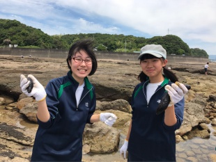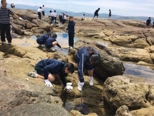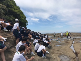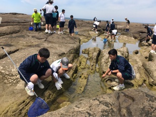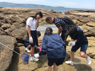 2017年06月09日(金) 中3 < 過去のニュース 中3 体験学習 本日、中3は、田辺市天神崎で、自然観察を行なっています。 10:30 目的地に到着し、自然観察を始めました。 天神崎到着 説明を聞いています。 魚がいる! ここにも! カニ、発見! ゲット! ナマコもへっちゃら! 意外と女の子の方が大胆。 目の前には、綺麗な海 まだまだ探すぞ〜