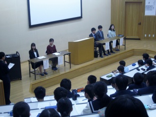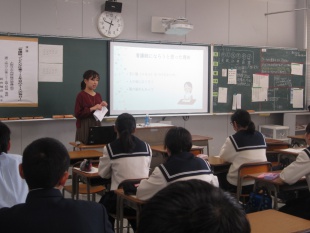 本日、中学3年生は、本校OBの社会人の方をお迎えし、キャリア教育を実施しました。5つの教室に分かれ、本校OBでさまざまな分野で活躍している先生方から仕事内容とともに、中・高時代の過ごし方を自身の今とリンクさせながら語っていただきました。