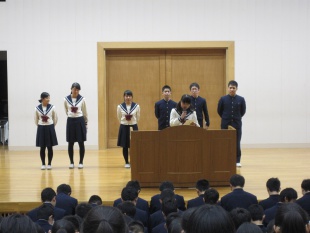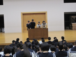 2015年02月23日(月) 中3 < 過去のニュース 中3 修学旅行 事前学習 本日2月23日の5、6限に修学旅行の事前学習を行いました。3月に行く修学旅行に向けて各々が調べ学習をして全員の前で発表しました。 皇居やJAMSTEC等の施設の紹介や豆知識を発表しました。 司会進行も生徒たち自身にさせ、生徒主体で事前学習を終えました。